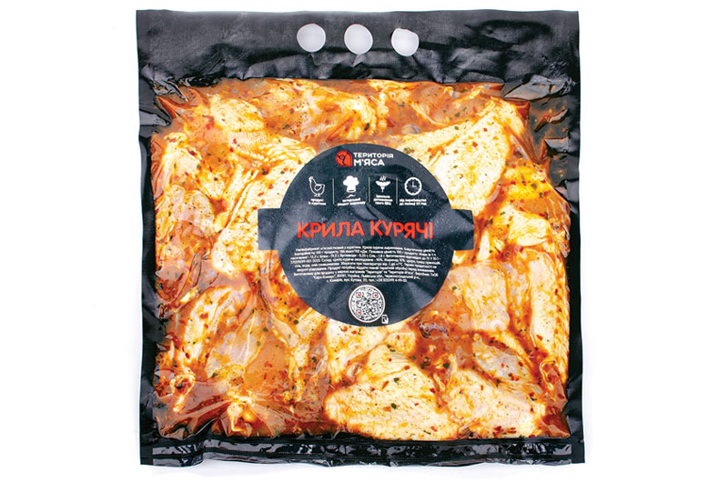 Склад Крило куряче охолоджене 90%. Маринад 10%: цукор, суміш прянощів, сіль, вода, олія соняшникова.