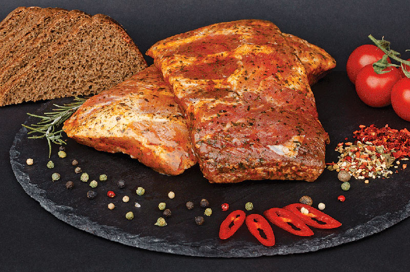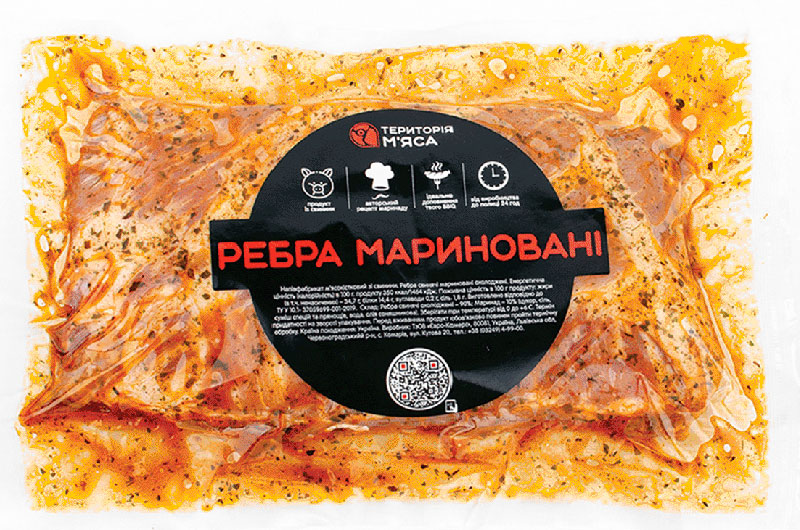 Склад Ребра свинячі охолоджені 90 %, Маринад 10%: цукор, сіль, суміш спецій та прянощів, вода, олія соняшникова.